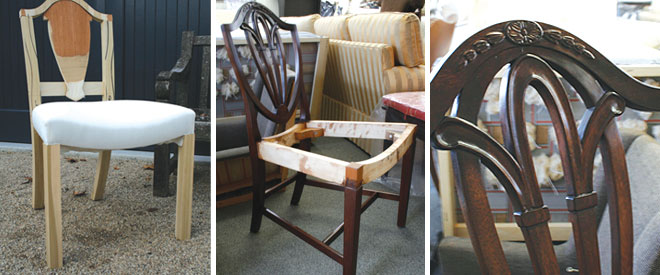 At Jessie Davidson Interiors we not only make our Adelaide Vaughan line of furniture, but we create custom pieces for clients when the need arises. One example is the Shield Back side chair shown in these images. We recreated the elements from an antique Shield Back chair for the back and legs of these side chairs, then added a fully upholstered seat large enough to accommodate today’s level of comfort. The final product has the look and patina of the original antique chair which inspired this project; and, captures the comfort and practicality desired by our client.