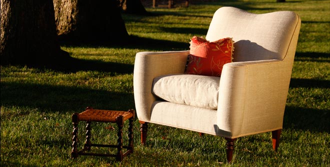 A tight upholstered back, deep seat and turned legs with casters distinguish the graceful lines of the Kati Chair.